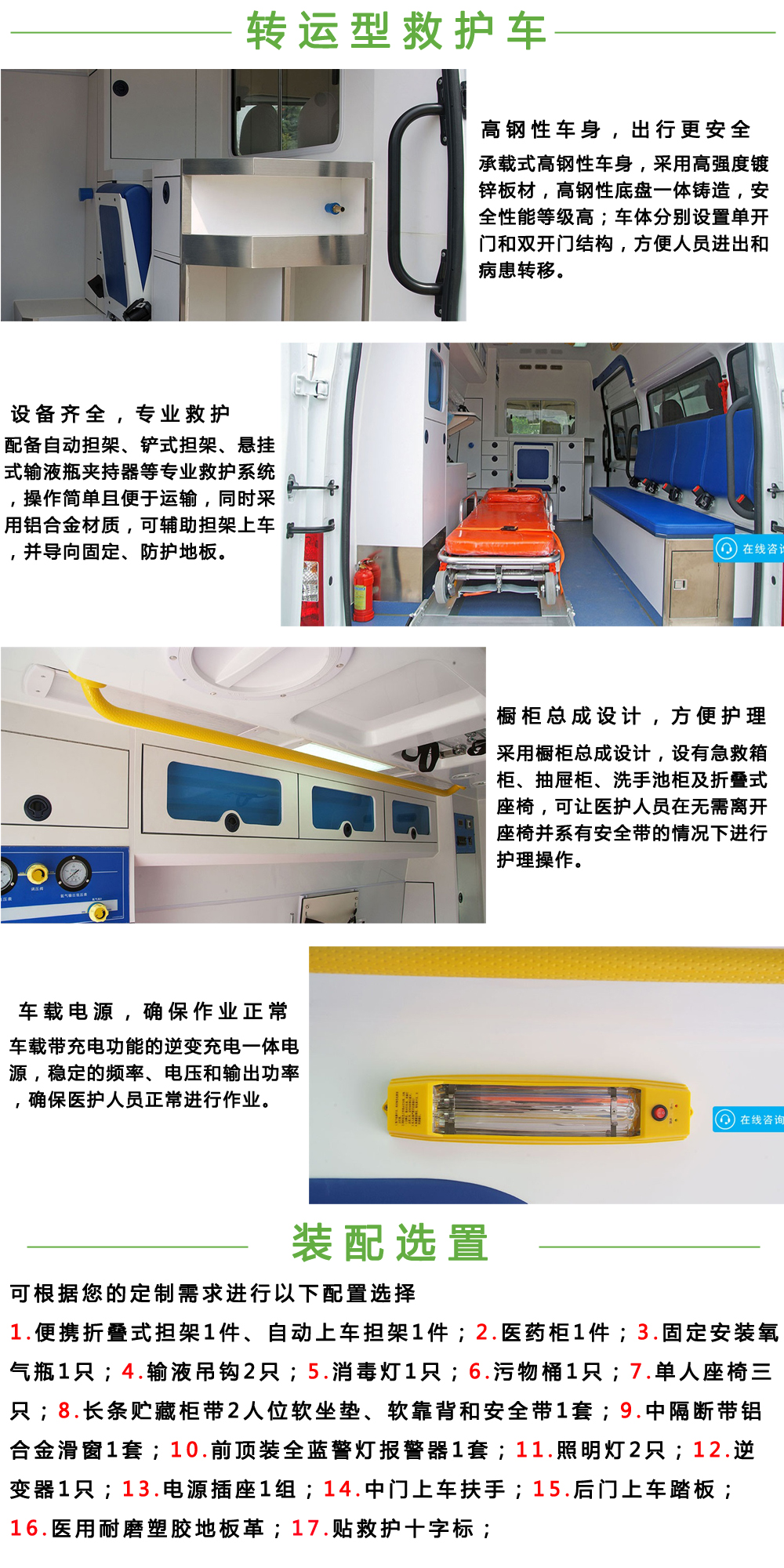 救護車,是指救助病人的車輛。而車身上的“AMBULANCE”是反過來寫的,這是為了讓前面的汽車司機通過后視鏡直接看到正方向的Ambulance單詞,從而迅速讓道。現代救護車的內部比較寬敞,使救護人員有足夠的空間去往醫院的途中對患者進行救護處理。現代救護車內還攜帶了大量的繃帶和外敷用品,可以幫助止血、清洗傷口、預防感染。