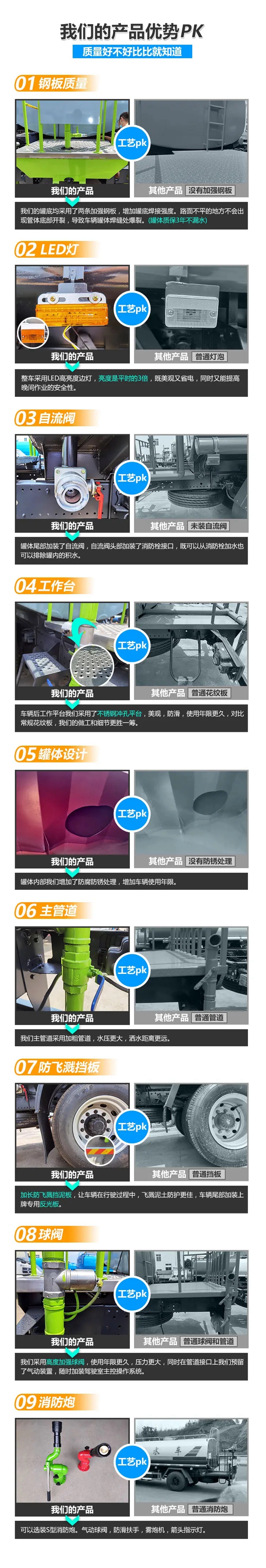 配5立方灑水罐,罐體采用優質武鋼4mm厚碳鋼板制作,罐體自動焊;配置灑水車專用自吸式離心泵(可選用杭州威龍40-50泵);前沖、后灑、側噴、帶后操作平臺、帶高壓水炮(噴射狀態可調節成柱狀直沖、大雨、中雨、小雨、毛毛雨及霧狀,可連續調節;360度旋轉),揚程28米,帶自吸功能,消防接口,其他標配。此車型環保免征齊全,上戶無憂。